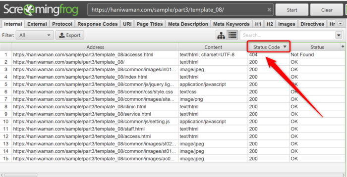 「Internal」タグからFilter → 「All」を選択して「Status Code」でソートをかけます。「200」は正常なので無視するとして、200以外が上にくるようにすると見やすくなります。