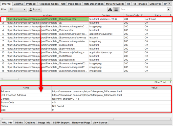 まず404のURL(行)をクリック。すると、下の空白エリアに詳細が表示されるようになります。今のままだと「このページは404ですよ」ってことしか分かりません。