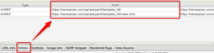 どこからリンクされているかは、下にある「Inlinks」をクリックすると分かります。「From」の列にあるURLが404を起こす原因となっているファイルです。このファイルを確認して修正してあげてください!!!