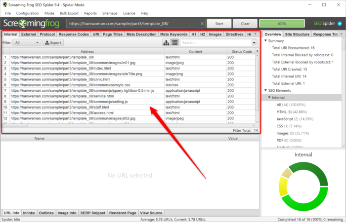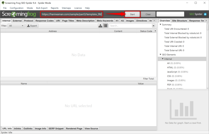 上部の「Enter url to spider」に調査したいURLを入力して、右側の「Start」ボタンをクリック。