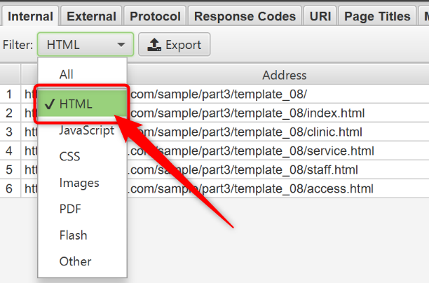 スクレイピングが終わったばかりであれば、「Inertnal」のタブが開かれているはずなので、Filter → 「HTML」を選択してHTMLファイルだけに絞り込みをします。