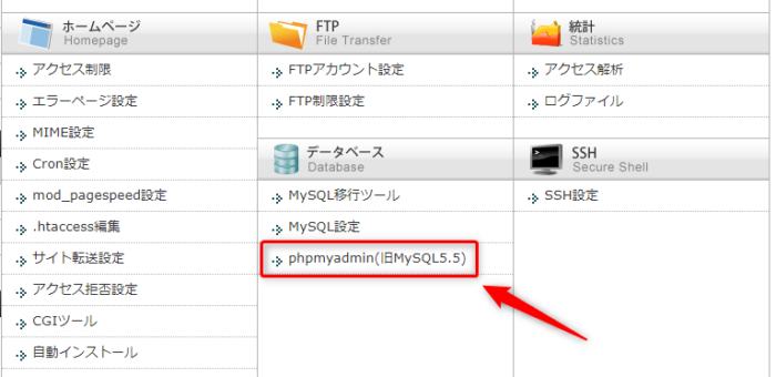 phpMyAdminにアクセスしてデータベースを操作します。メジャーなレンタルサーバーであれば管理画面からアクセスできるようになっているはずです。