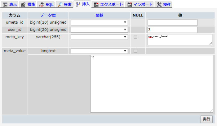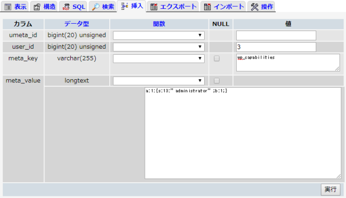 登録したユーザーIDを使って「wp_usermeta」に権限に関する2つの項目(wp_user_levelとwp_capabilities)を追加していきます。