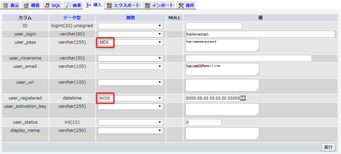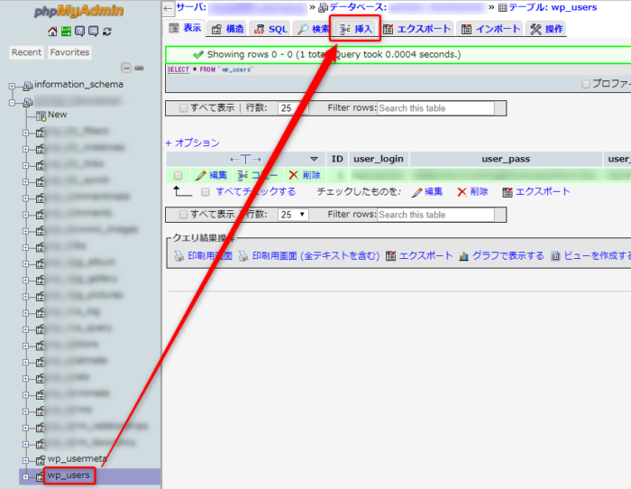 wp_userのテーブルを開いて「挿入」タブをクリックします。
