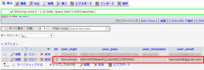 「wp_user」と「wp_usermeta」に管理者権限のアカウントを追加していきましょう。