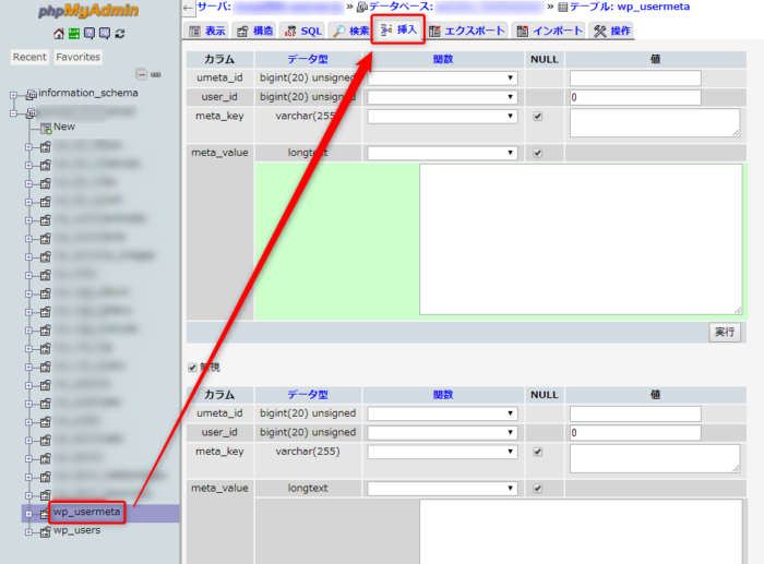 wp_usermetaテーブルを開いて「挿入」タブを開きます。