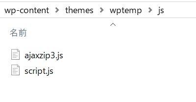 ダウンロードしたajaxzip3.jsをテーマフォルダの中に入れておきます。jsフォルダの中に入れてみました。