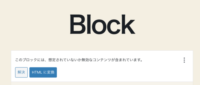 ただしこのままだと型が保存されません…。試しにリロードすると、「このブロックには、想定されていないか無効なコンテンツが含まれています。」となってブロックが消えます。