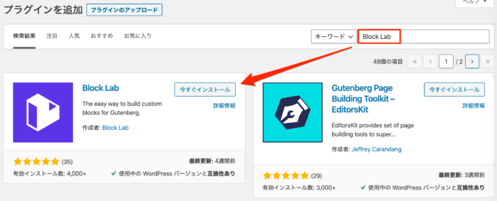 プラグイン → 新規追加 → キーワード「Block Lab」 → 今すぐインストール → 有効化