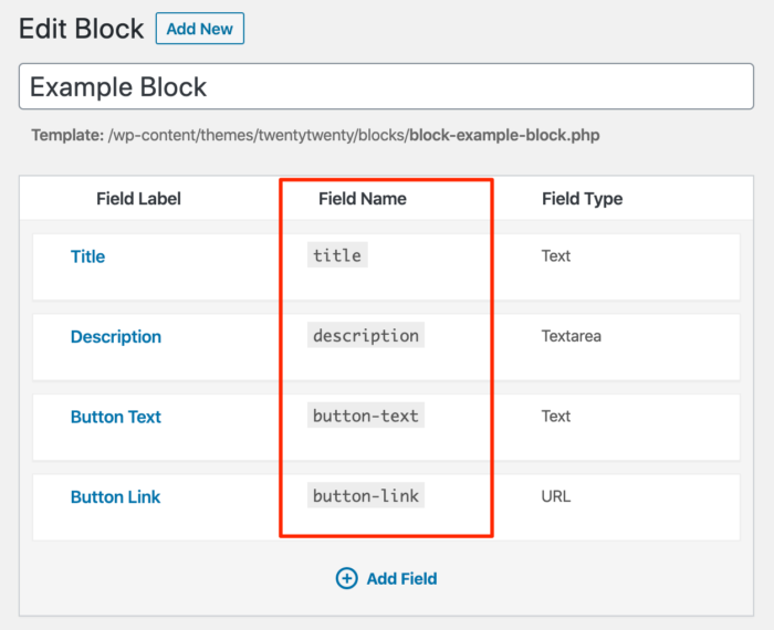 例えば、「Title」であれば「Field Name」が「title」なのでblock_field( 'title' )として利用できます。