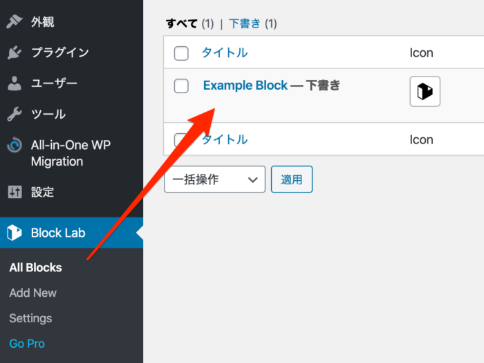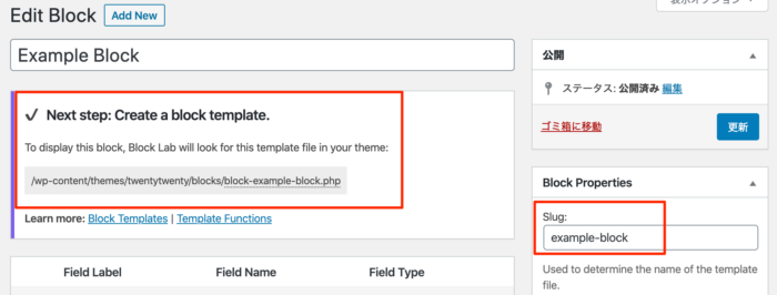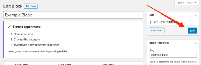 まずは何も考えずに「Example Block」を公開してみましょう。