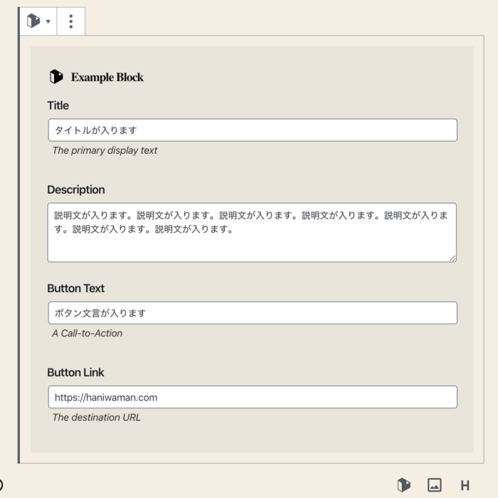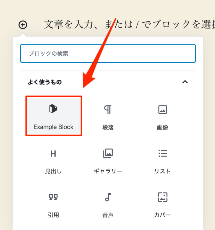「Example Block」という下書きが用意されているので、こちらを触りながら使い方を紹介していきます。