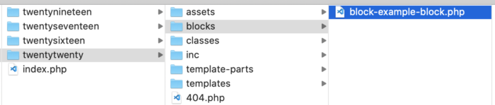 今回のケースだと、blocks/block-example-block.phpという名前のファイルを作成すればOKということですね。