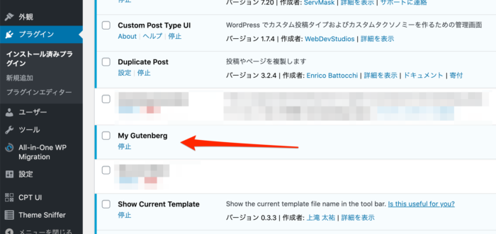 */「My Gutenberg」というプラグインがプラグイン一覧に表示されるようになるので、有効化しておきます。