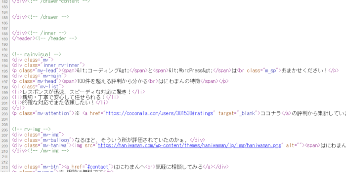 「view-source:https://haniwaman.com/lp/」のようなURLとともにHTMLタグで書かれたページが表示されます。