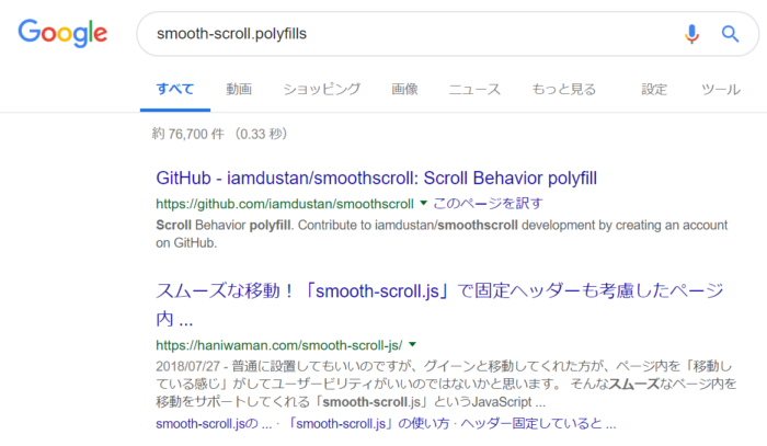 記事が出てきました。検索結果のタイトルから「スムーススクロール」系のライブラリっぽいことが分かりますね。(そもそもファイル名からイメージできそうですが…)
