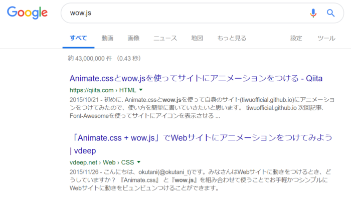 「wow」のように、他の意味が優先されそうな単語については、「wow js」や「wow ライブラリ」、「wow.js」みたいな感じで検索すると出てくる確率が高くなります。