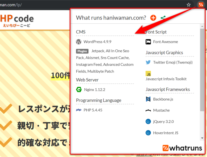 「What Runs」というChromeの拡張機能を使うと、めっちゃ大雑把に利用されている技術を確認することができます。
