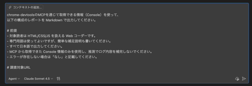 chrome-devtoolsのMCPを通じて取得できる情報(Console)を使って、