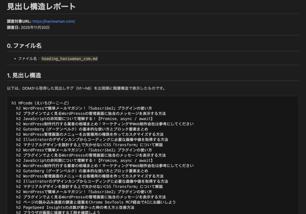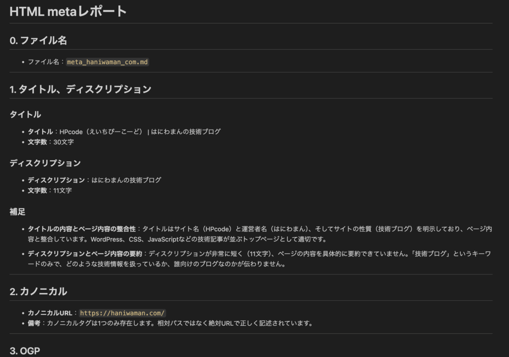 以下の構成の「HTML metaレポート」を Markdown で出力してください。
