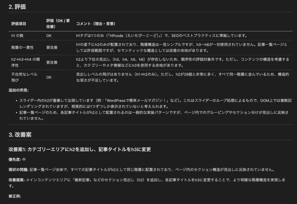 チェック対象のURLをAIに渡してチェックしてもらう流れになります。依頼の内容はAIと一緒に考えました。依頼内容によってAIの返答の内容が変わってきますので、欲しい情報に合わせて調整してもらえたらと思います。