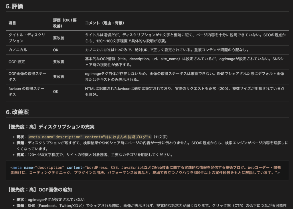 まずは、タイトル、ディスクリプション、OGP、ファビコン、カノニカルを確認してもらいます。確認してもらった後に評価と改善案までセットでお願いしています。
