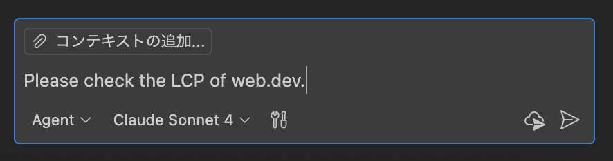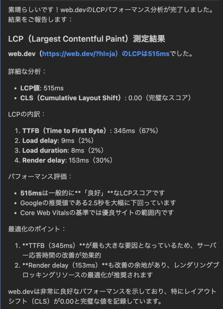 すると、AIが処理を開始してくれます。ブラウザが立ち上がり「https://web.dev/」が開いてLCPを確認してくれるはずです。