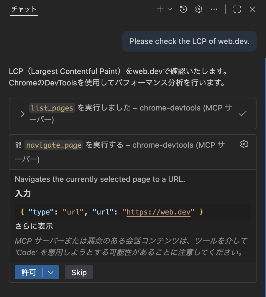 許可が求められたら実行しても問題ないタスクかを確認して許可していきます。以下の場合は「https://web.dev/」を開いていいですか?と聞かれている様子です。