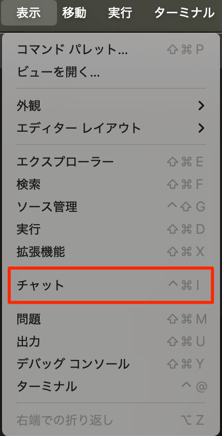}設定できたら、以下を入力して動作を確認してみましょう。「表示」から「チャット」を開きます。