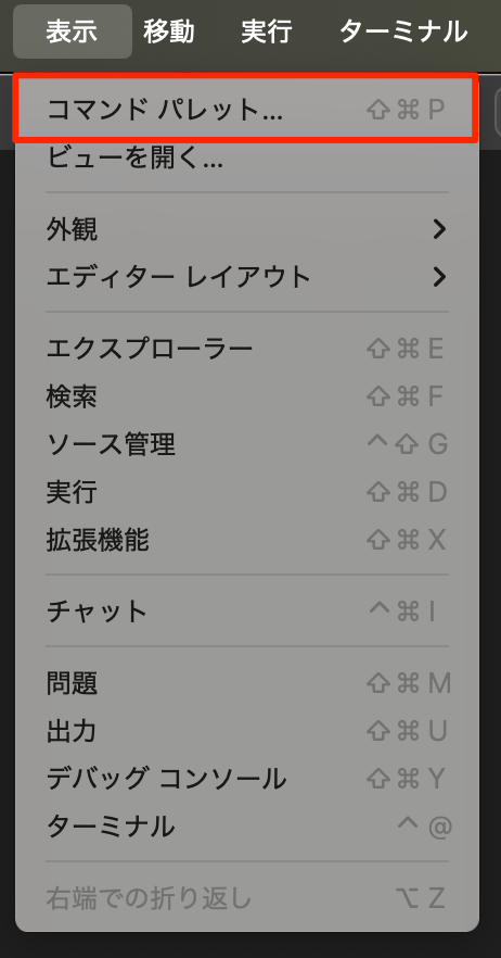 上部のメニューの「表示」から「コマンド パレット」を開きます。