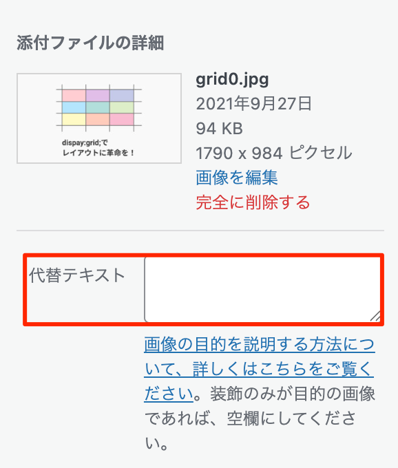 評価や改善案も基本的には「サムネイル画像にaltをつけてください」という内容です。WordPressの場合はメディアのアイキャッチ画像として設定してる代替テキストに入力することで反映されるようになります。