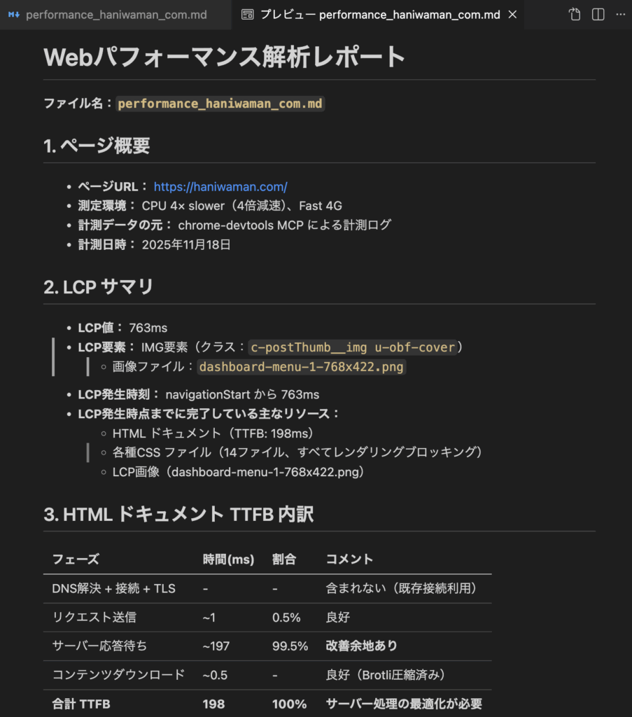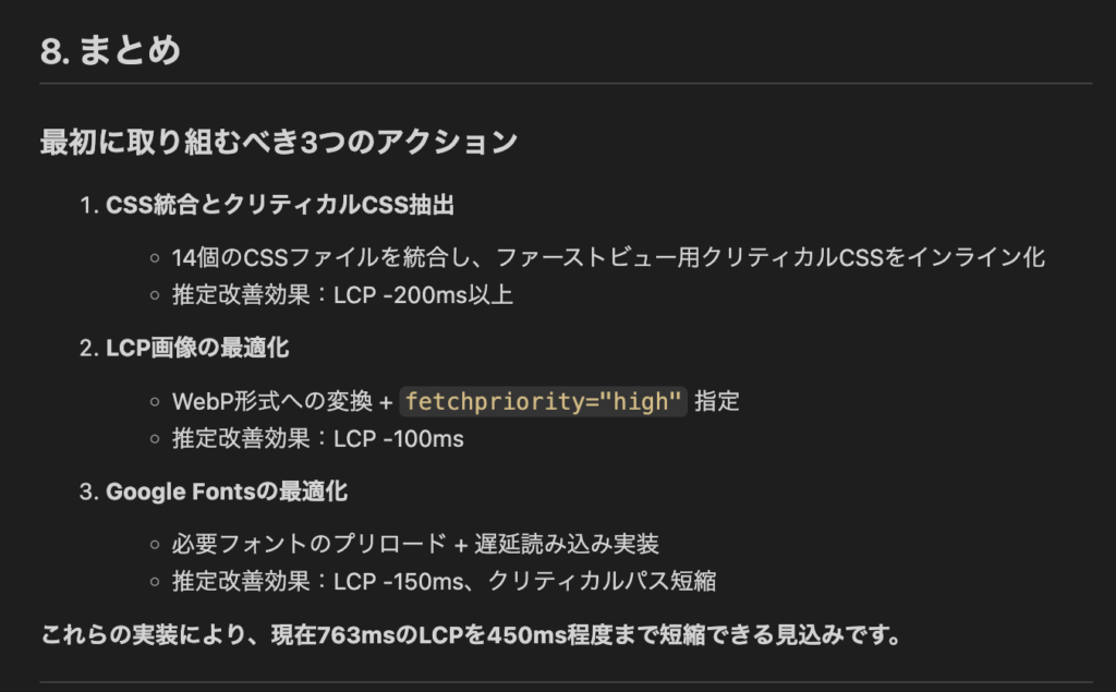 上の方は調査結果です。「7. 具体的な改善策」や「8. まとめ」が具体的な改善の提案となります。最後の3つの提案を見ると「1. CSS統合とクリティカルCSS抽出」「2. LCP画像の最適化」「3. Google Fontsの最適化」が残っていました。確かにと思う内容な気はします。