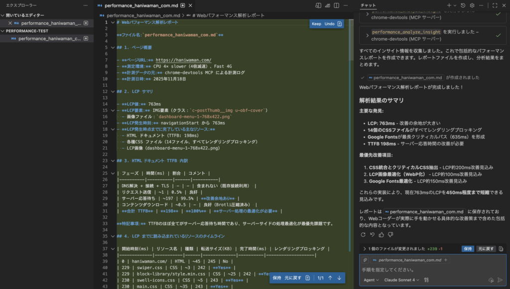Chrome DevTools MCPを使うことで、「人の目でひとつずつ確認していた作業」を AI に任せられるようになり、調査から改善案までの流れを大きく効率化できそうです。