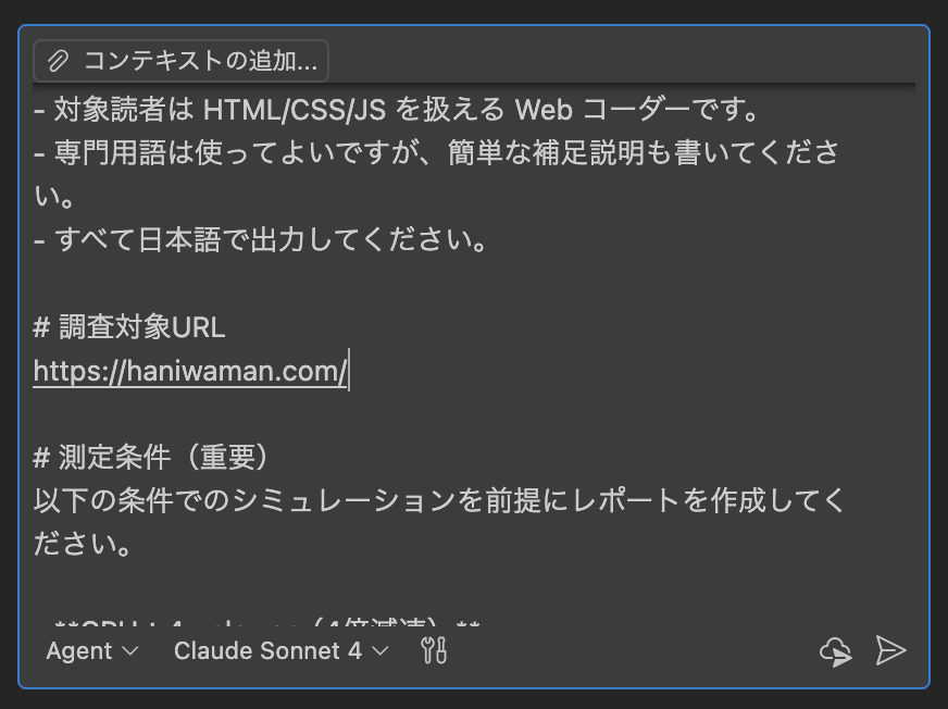 では、先ほどのプロンプトで依頼してみましょう。調査対象URLにはこのブログのURLを入れてみます。ファイルを編集して欲しいのでモードはAgentにしておきましょう。