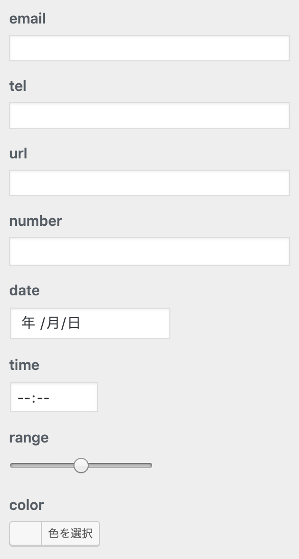 あとは、passwordとかも使えましたね。たぶん、formのtypeに指定できるものは全部指定できると思います。