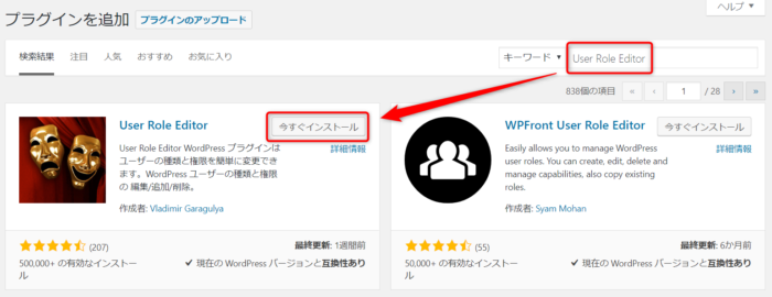 外観 → プラグイン → 新規追加 → キーワード「User Role Editor」 → 今すぐインストール