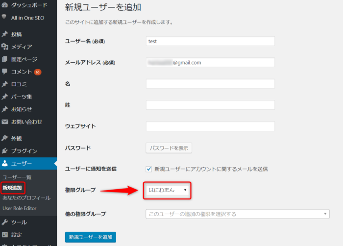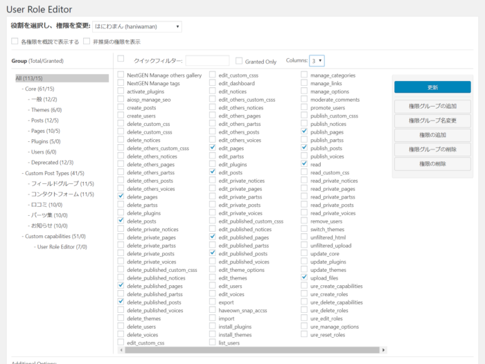 それではUser Role Editorを使って、「はにわまん」の権限を追加していきましょう。