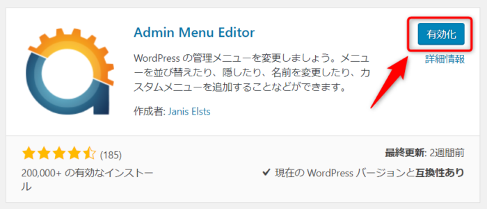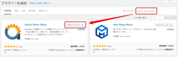 外観 → プラグイン → 新規追加 → キーワード「Admin Menu Editor」 → 今すぐインストール