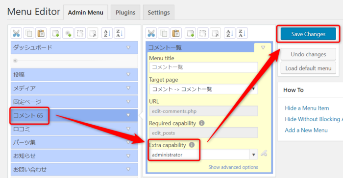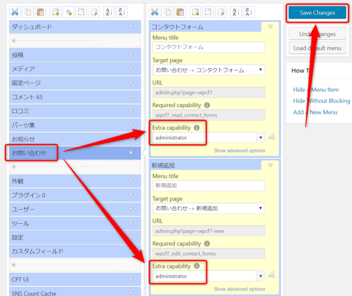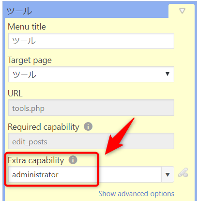 「Extra capability」に設定したユーザー権限以外は表示されないようにできるので、ここを変更していきます。