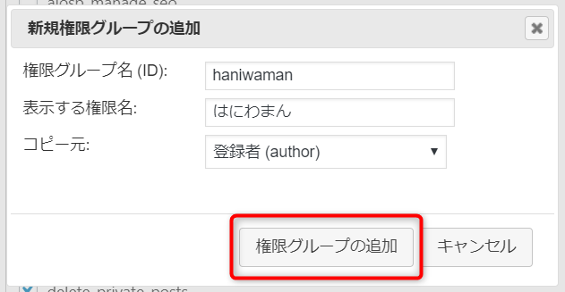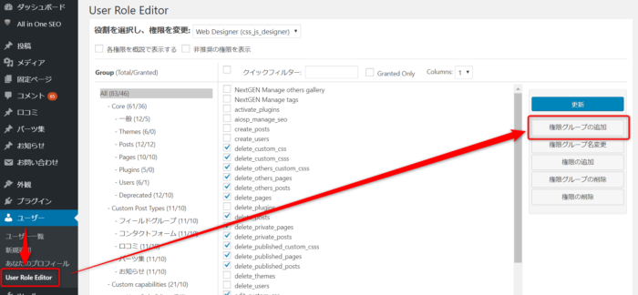 ユーザー → User Role Editor を開いて、「権限グループの追加」ボタンをクリックします。