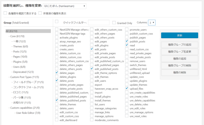 作ったばかりのはにわまん権限は以下のような設定です。(「Columns:3」にしておくと一覧時に見やすいです)