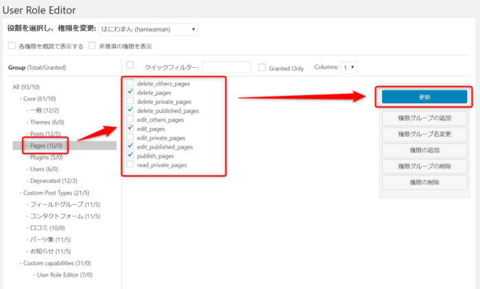今のままでは固定ページの編集権限がないので、上にあるPostsを参考にしつつ追加していきます。チェックしたら「更新」ボタンから更新してください。