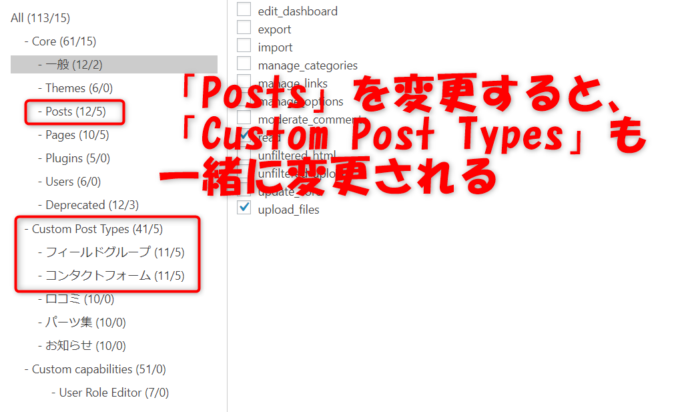ただし、他のプラグインで追加されたカスタム投稿タイプの権限がPostsなのでまだ残ってしまっています。。