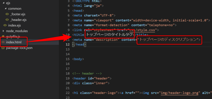 そして、var titlevar descriptionは変数で表現している部分で、共通パーツである_header.ejs内の<%- title %><%- description %>に反映されることになります。
