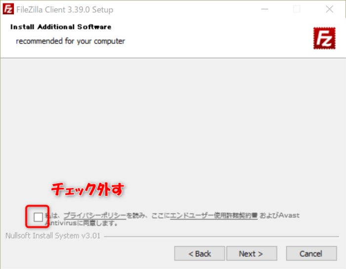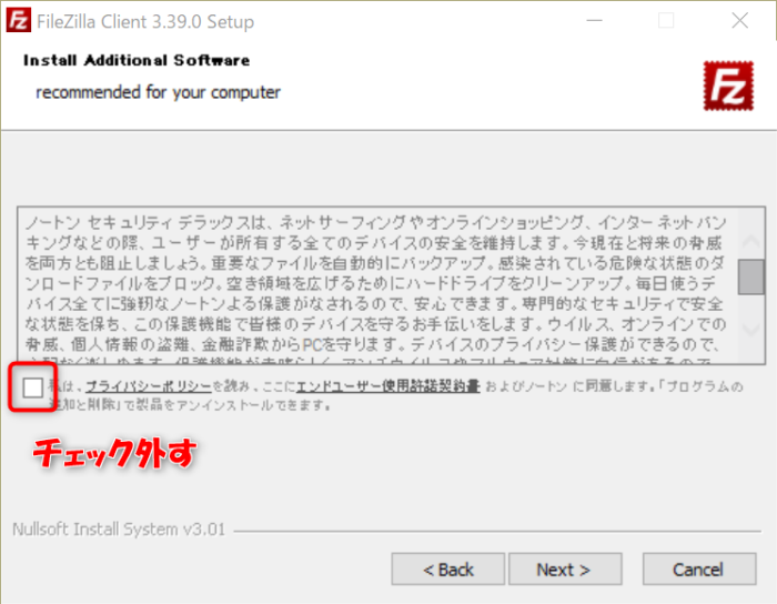ただ、途中で広告として、ウイルスソフトのインストールがしてっと混ざっているので、不要な場合はチェックを外しておきましょう。