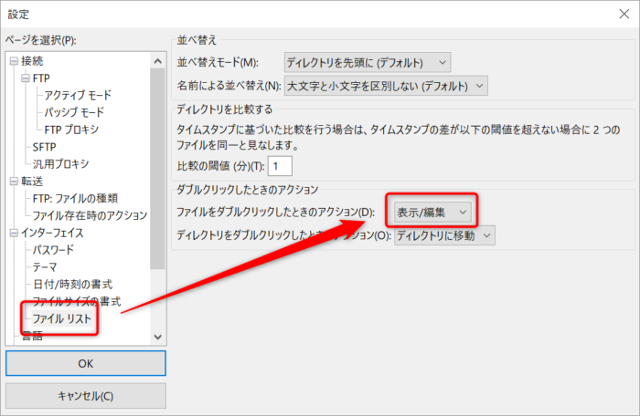 インタフェースのファイルリストから「ファイルをダブルクリックした時のアクション」を「表示/編集」であることを確認してください。