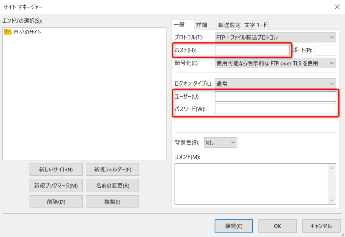 ホスト名やユーザー、パスワードの情報は各種レンタルサーバー会社と契約したときに受け取れます。おそらくメールが届いているはずなので、そちらを参考にして入力するようにしてください。