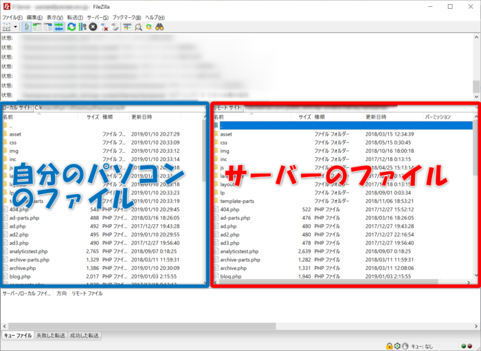 サーバーと接続した時のFileZillaの画面ですが、確実に押さえておくべき箇所は、左がローカル(自分のパソコン)、右がサーバーのファイルということです。