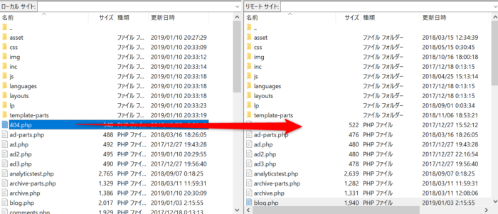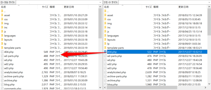 アップロードするときは左側にローカルで修正したファイルを配置するようなイメージになります。