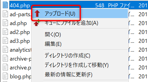 右クリックから「アップロード」を選択してもアップロード可能です。この時のアップロード先は、右のリモートのエリアに表示されているフォルダになります。